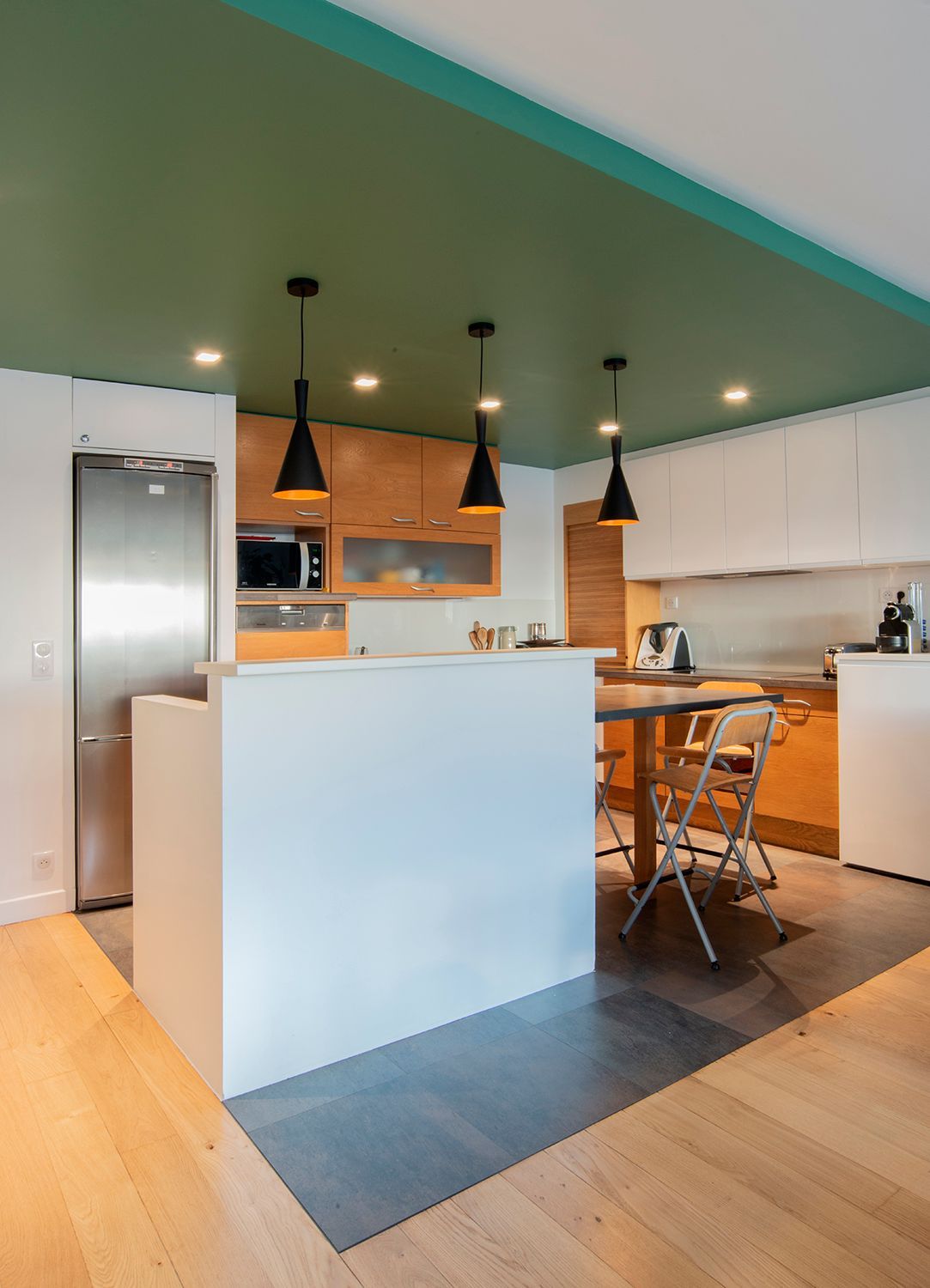 Tous les murs ont été repeints. À la demande des clients, une couleur spécifique rehausse chacune des pièces pour leur donner une ambiance particulière en adéquation avec leur fonction.
