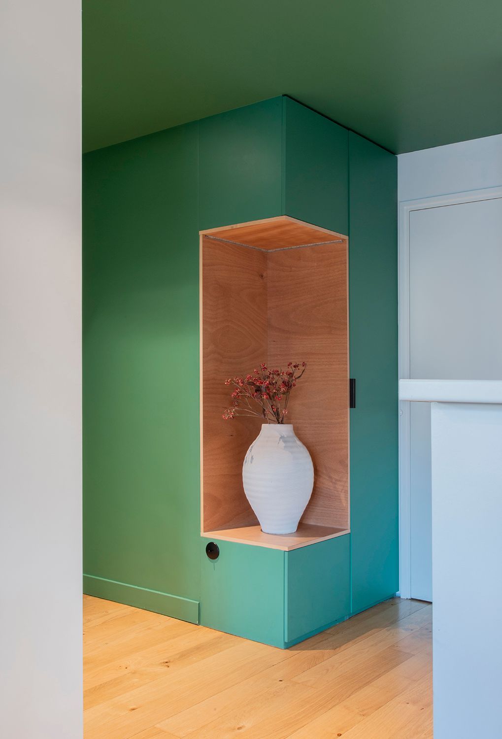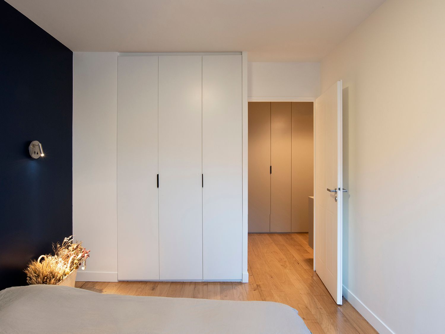 Plusieurs ensembles de placards sur-mesure ont été redéployés aux endroits stratégiques de l’appartement pour assurer tous les besoins de rangements tout en articulant les circulations.